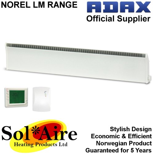 PRODUCT DESCRIPTIONS:The compact Norel LM low profile convector heaters combine advanced performance with stylish good looks to provide superior heaters for both domestic or commercial use. The heaters are child friendly with no sharp edges, low surface temperatures and safeguarding against overheating. Norel wall mounted panel heaters are the popular choice for home owners, contractors and etc. who demand stylish, space saving and efficient electric heating systems at a reasonable price. Convection heat for rapid warm-up. High precision adjustable thermostat responds to very small changes in room temperature. Max. ± 0,5°C Frost protection setting allows for +5°C minimum set point. Front air outlet grille for efficient heat circulation. Detachable hinged wall mounting frame for fast installation and easy cleaning. Manufacturer ADAX. Model LM07T. Power: 700 W. Measurements (height x length x depth): 180 x 943 x 84 mm. Voltage: 230 V. Weight: 3,3 kg. Safety cut-out Installed. Minimum distance from top: 100 mm. Minimum distance from floor: 50 mm. 5 year guarantee. Supplied with the Solaire Wireless Controller & Receiver. The wireless control unit can be situated in any room within 60 metres of the heater without the need for wiring between the two units. The wireless control unit is large, easy to read and understand, with a LCD display showing day, time, actual temperature, set temperature and program mode. There is 5 day (weekday) and 1 day + 1 day (Sat/Sun) programming with four separate time/temperature periods per day.