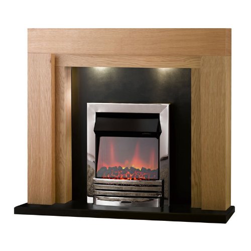 PRODUCT DESCRIPTIONS:Bold and traditional, the Montana Fireplace Suite is a striking piece that deserves a prime spot in your interior. The square surround includes downlights and is finished in oak, with an authentic and intricate grain that can't help but impress. The surround stylishly contrasts with the ink black back panel and hearth, on which stands a smouldering chrome Eclipse Electric Fire. This is a stately suite that you will be proud to show off in your living room.